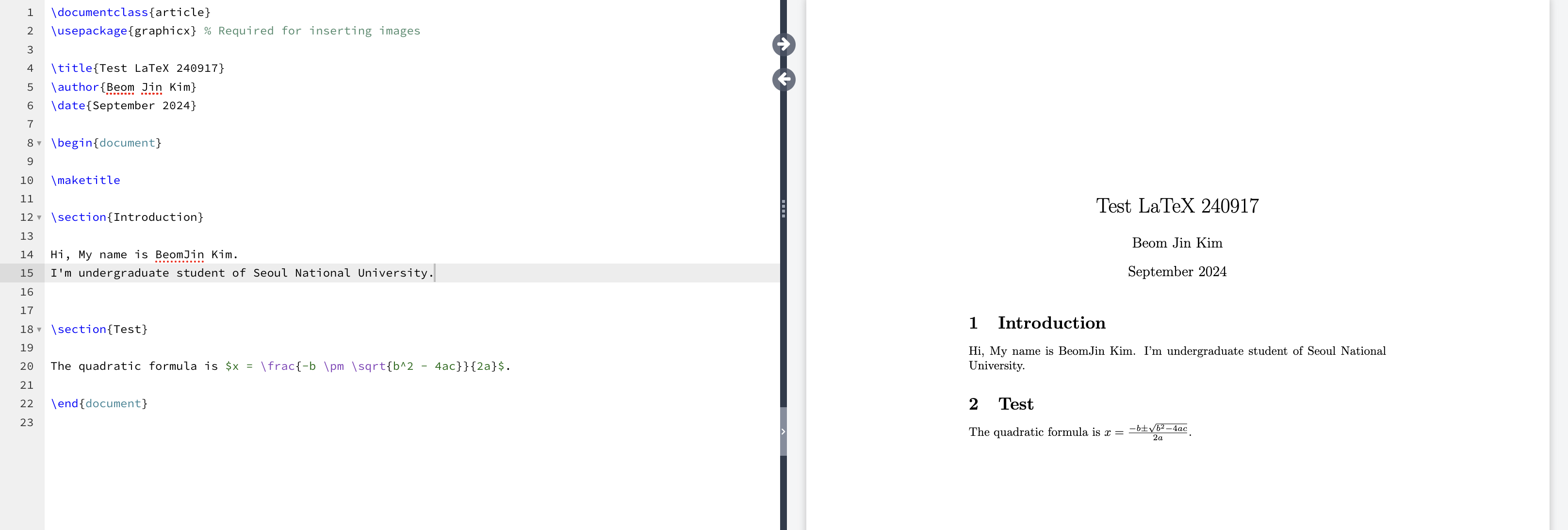 좌측은 LaTeX 혹은 Visual Editor로 수정할 수 있는 화면이고